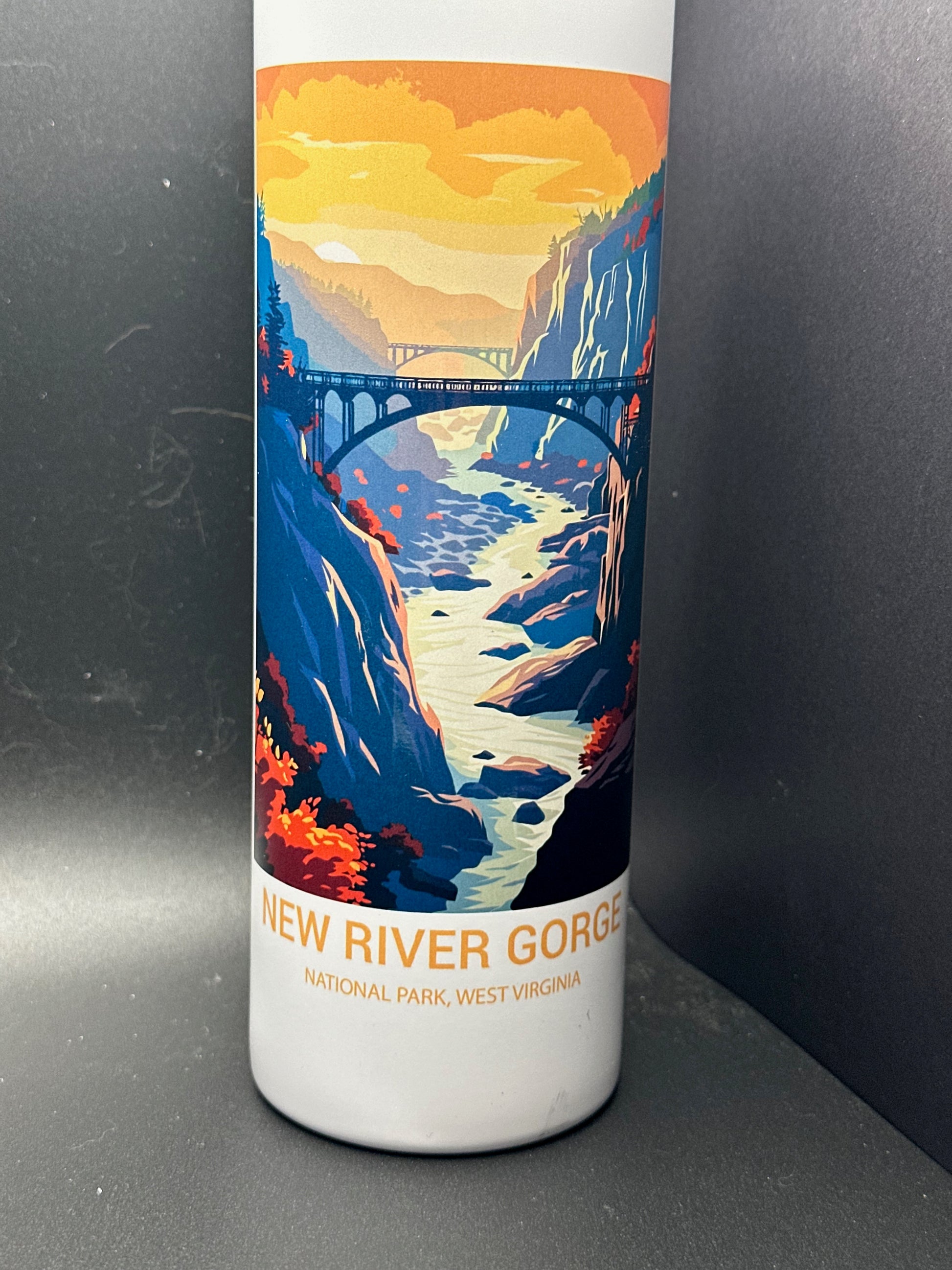 Fuel your adventures with a touch of wild beauty. This 20oz stainless steel tumbler celebrates the rugged charm of New River Gorge National Park, with a durable design built for travelers, hikers, and national park lovers alike. Whether you're watching sunrise over the cliffs or dreaming of your next road trip, this tumbler keeps your drinks perfectly hot or cold—wherever the trail leads.